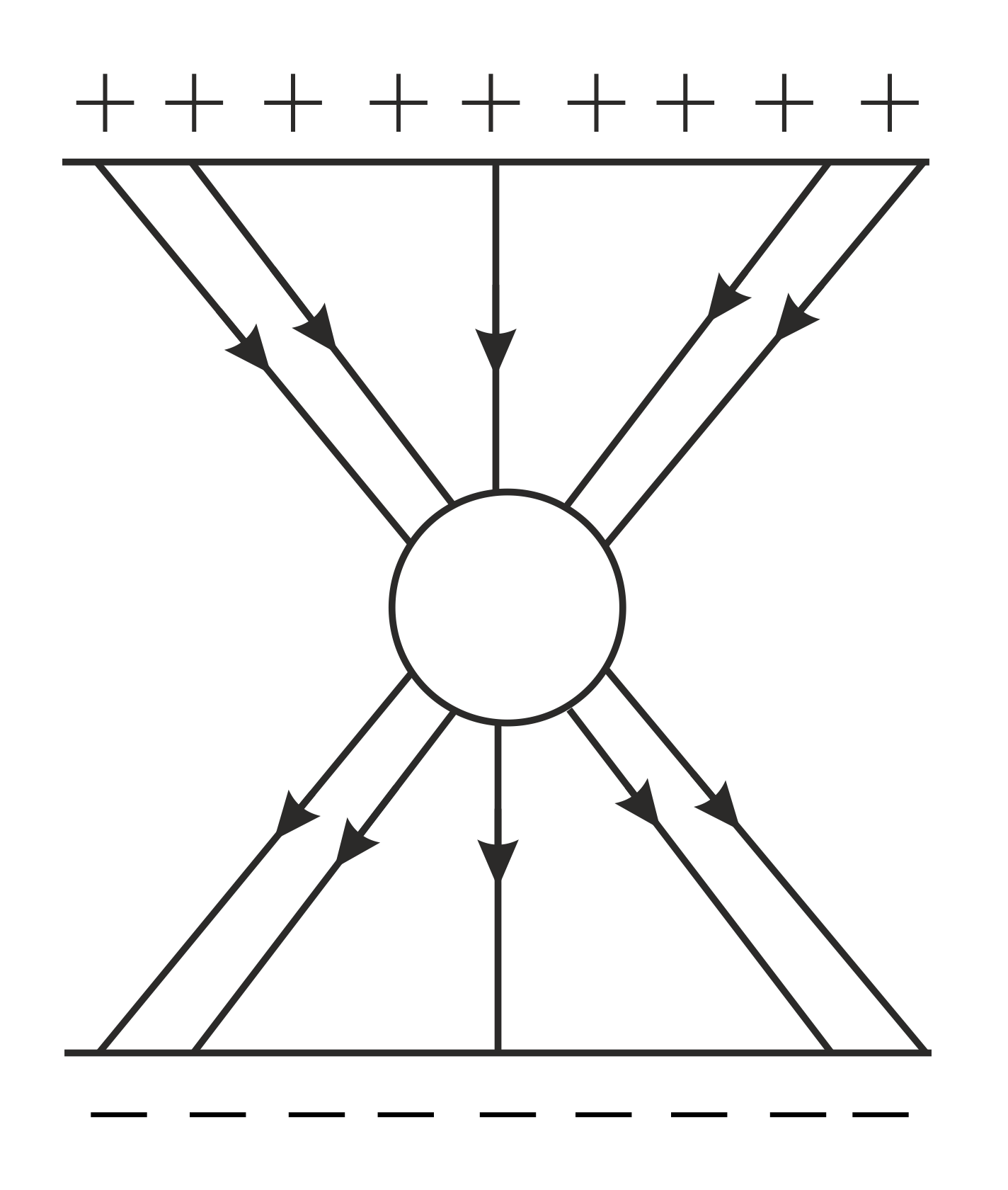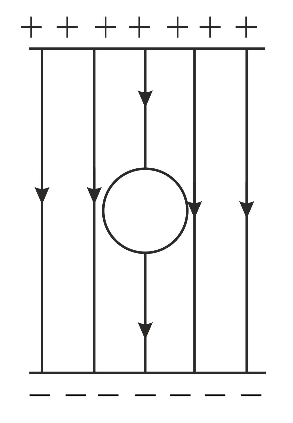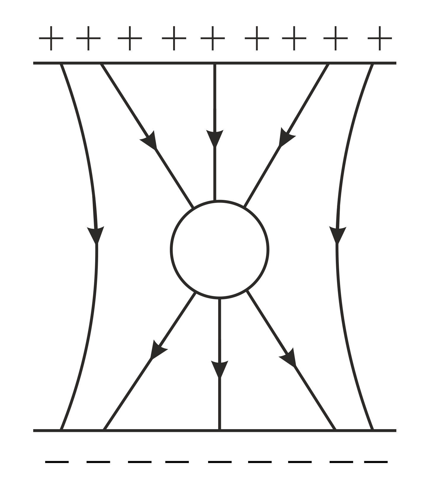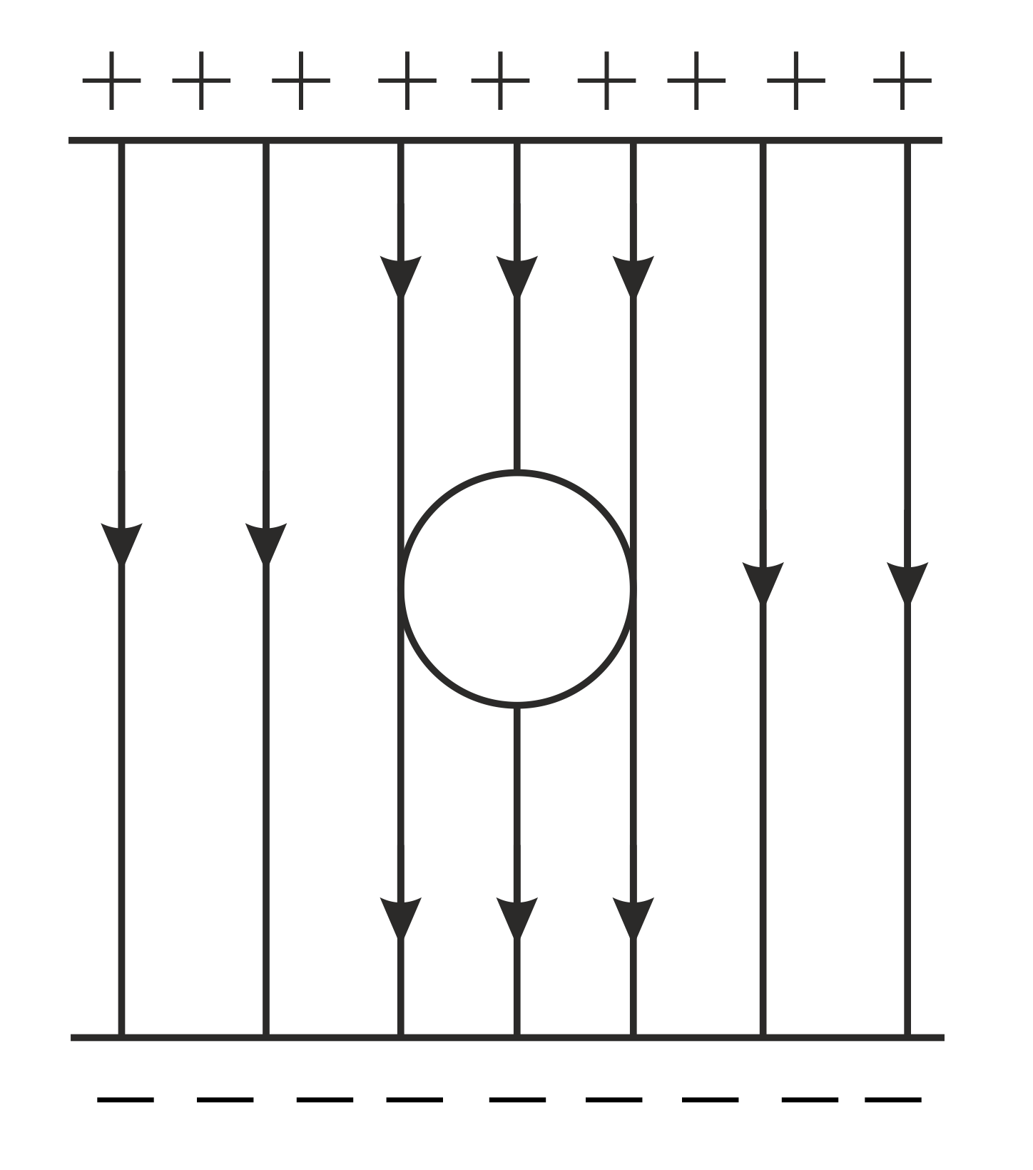 An uncharged sphere of metal is placed inside a charged parallel plate capacitor. The lines of force will look like