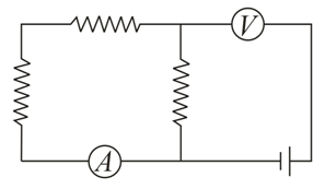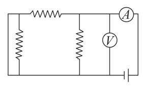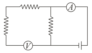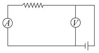 In the circuit shown below, a student performing Ohm's law experiment accidentally puts the voltmeter and the ammeter as shown in the circuit below; the reading in the voltmeter will be close to
